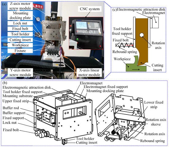 The experimental parameters are detailed in Table 2. To capture the microstructure evolution of the PZ during cutting, it is necessary to preserve the instantaneous cutting state. This study introduced an electromagnet rotation-type quick-stop device for “freezing” the cutting state at specific moments. Unlike traditional quick-stop device that uses high-pressure gas explosion shocks or springs, this device offers precise control and minimal delay through rapid electrical signal control, ensuring accurate “freezing” of the instantaneous cutting state. An illustrated diagram of this device is shown in Figure 1.