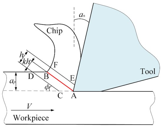 The PZ is an extremely narrow region. While cutting, the PZ experiences significant strain rates. This study adopted the unequal shear zone model proposed by Astakhov [28], which splits the PZ into two parts of unequal length. A schematic diagram of the model is shown in Figure 3.
