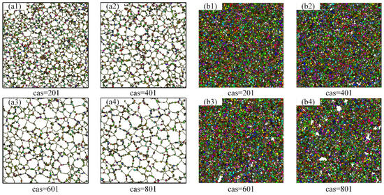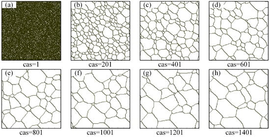 The simulated images of the initial austenite microstructure at different time steps (cas) are shown in Figure 5. It is evident that with the evolution of microstructure, the grains continue to grow, mainly manifested as the boundary migration of large-volume grains through engulfing smaller-volume grains, resulting in an increase in average grain size.