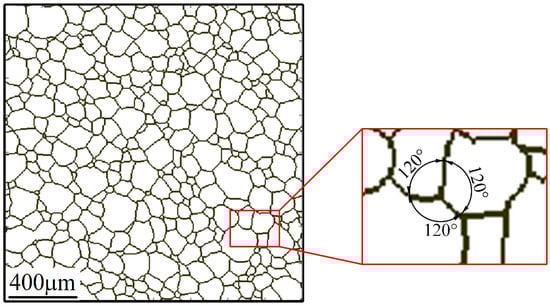 The initial microstructure used for the DRX model in this study is shown in Figure 7, which contained 160,000 cells with dimensions of 4 × 4 μm. The angle between adjacent three grain boundaries is approximately 120°.