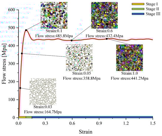 Stage I ( < 0.1) was the preparation period for DRX. In this stage, only a small amount of DRX occurred, and the average dislocation density sharply increased (i.e., working hardening), as depicted in Figure 11a–c. Meanwhile, the thermal softening effect inside the material was far less significant compared to working hardening and insufficient to offset it. Therefore, the flow stress curve maintained an upward trend in this stage, as shown in Figure 10.