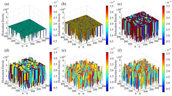 The variation of dislocation density during DRX process: (a) = 0.04, (b) = 0.065, (c) = 0.085, (d) = 0.13, (e) = 0.6, and (f) = 1.5.