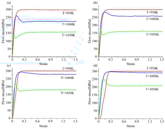 Flow stress curve: (a) strain rate = 0.5 s−1, (b) strain rate = 1 s−1, (c) strain rate = 2 s−1, and (d) strain rate = 4 s−1.