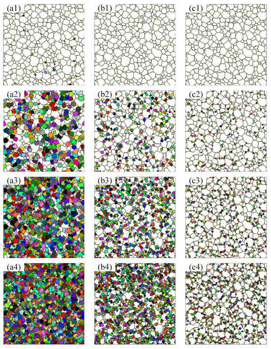 DRX microstructures obtained by CA simulation at different strain and strain rates: strain: (a1–c1) = 0.5, (a2–c2) = 1.0, (a3–c3) = 2.0, and (a4–c4) = 3.0 in rows 1–4; strain rate: (a1–a4) 0.5 s−1, (b1–b4) 1.0 s−1, (c1–c4) 2.0 s−1 in columns a–c.