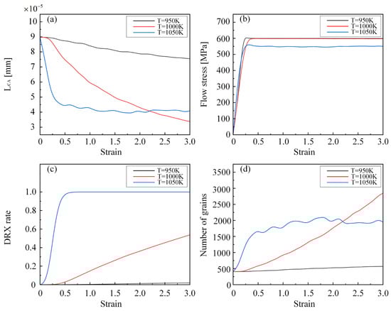 Figure 16 illustrates the impact of temperature on DRX-related parameters. It can be seen from Figure 16a that the average grain size at 1000 K was smaller compared to those at 1050 K and 950 K, indicating that a moderate deformation temperature could facilitate sufficient DRX without excessive grain coarsening. This result aligned with the above discussion. Therefore, selecting an appropriate deformation temperature is essential for promoting the refinement of grains.