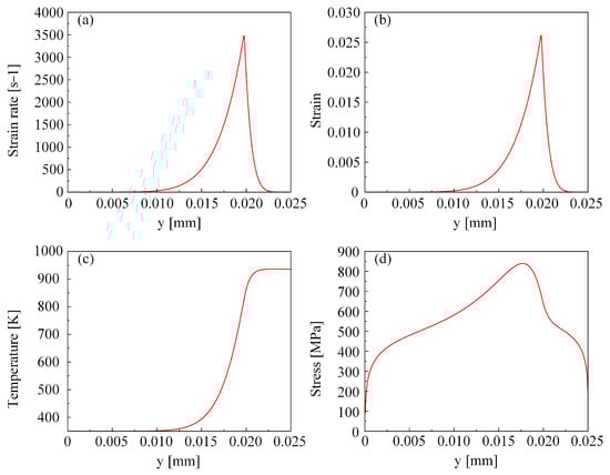 Parameter distributions of the PZ: (a) strain rate, (b) strain, (c) temperature, and (d) stress.