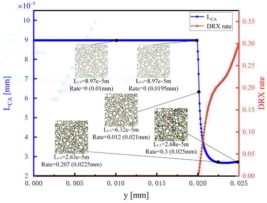 Through an iterative simulation of DRX within each shear plane, the DRX situation across the PZ could be obtained. The distribution curves of average grain size and recrystallization proportion are shown in Figure 19. It can be seen from the figure that as the y value increased, the average grain size initially remained constant before gradually decreasing. The average grain size reached its minimum value near the termination shear line and gradually stabilized.