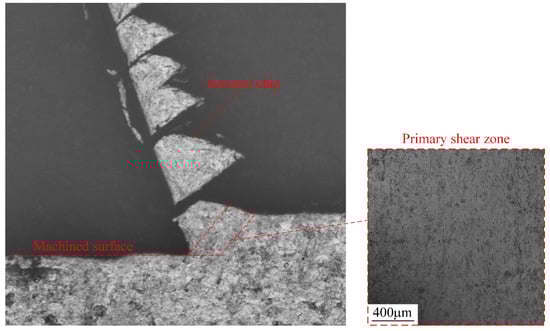 As the strain rate diminished near the final shear line, a small amount of large-volume grains nucleated at the grain boundaries. Although the recrystallization ratio continued to increase, the average grain size approached a state of stability because the size of the new grains was comparable to those of the original grains. Figure 20 displays the experimental image of DRX on the primary shear plane.