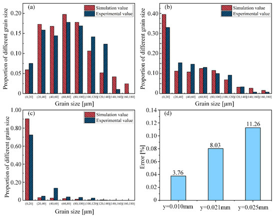 As y increased, the proportion of large-volume grains gradually decreased due to the nucleation of small-volume grains nucleated at the grain boundaries. The error between the simulation and experimental values is shown in Figure 21d. From the figure, it was evident that the error increased with y due to the significant number of nucleated grains at grain boundaries.