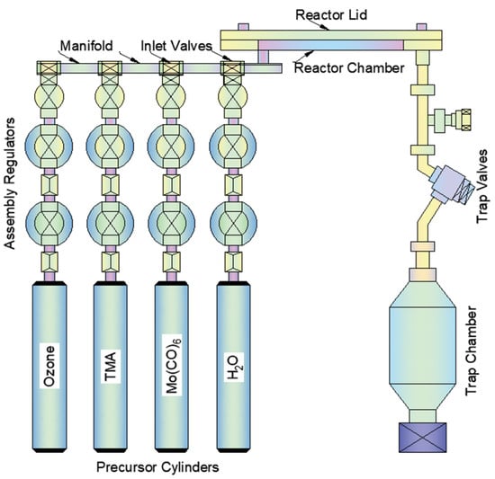 The Mo(CO)6 precursor used for MoO3 growth was procured from Strem chemicals. The Mo(CO)6 had a specified melting point of 150–151 °C, boiling point of 156 °C, and vapor pressure of ~0.8 Torr at 40 °C. The Vecco Savannah Ultratech thermal ALD system equipped with an Ozone generator and mass flow controller for 100 SCCM N2 carrier gas was used. The four precursor canister lines were connected to the reactor via a manifold, as seen in Figure 3. Table 1 shows the user interface for developing a recipe for the Vecco thermal ALD system, with the precursor pulse time, wait time, reactant pulse time, wait time, and number of cycles instructions on lines 11 to 15, which is the ALD growth cycle.