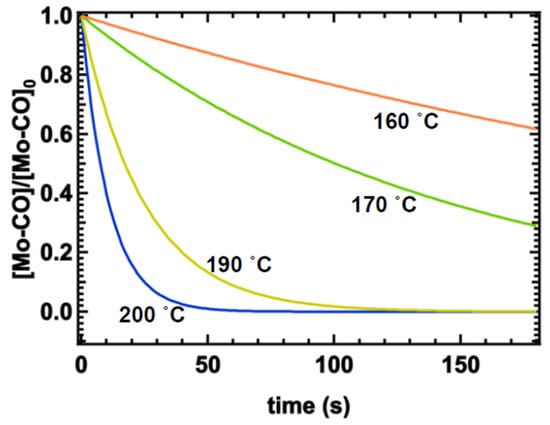 For an Mo-CO bond, A = 1015.6 s−1, Ea = ~150,624 J/mole [aa], R = 8.3145 J/mol/K, and T = 423 K (160 °C) to 473 K (200 °C). For these parameters, the time vs. reaction rate plot is given in Figure 6.