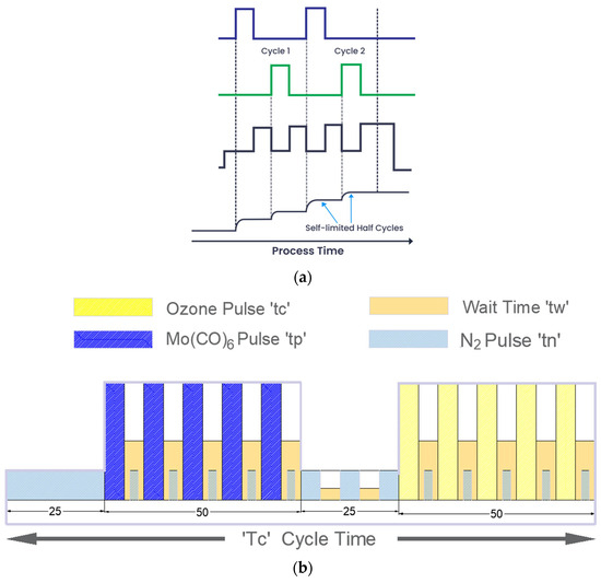ALD synthesis is derived from CVD, where alternate pulsing of a vaporized precursor (MoCO6) and reactant (Ozone) separated by a purge time (or wait time) causes a self-limiting chemisorption over the entire substrate [41,42]. Due to irreversible self-limiting chemisorption, ALD provides precise control over the thickness and conformal growth of thin films.