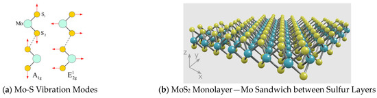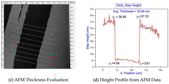 An alpha300R Confocal Raman Microscope (WITec GmbH, Ulm, Germany), with the objective Zeiss EC Epiplan-Neofluar 100×/0.9 equipped with a 532 nm laser and two gratings, 1800 g/mm for Raman and 300 g/mm for photoluminescence (PL), was used for determining the bonding vibration characteristics of MoS2 flakes. The signature bonding vibration for Mo-S bonds in thin-film MoS2 was characterized for Raman shifts for in-plane vibrations E2g (381.25 cm−1) and the out-of-plane vibration peak A1g (405.6 cm−1) in Figure 13a.