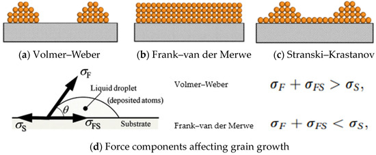 The AFM thickness profile of Figure 8d reveals a thickness of about 32.84 nm for an average of ten measurements, as seen in Figure 8c, with lines traversed across two ALD MoO3 layers. From the AFM and SEM observations, the nucleation and grain growth mechanisms are outlined in Figure 9. Based on the grain boundaries and the shape of the grains, it can be inferred that the ALD cycle resulted in the Volmer–Weber and Stranski–Krastanov regimens of Figure 9a,c [60]. The Frank–van der Merwe (FvM) regimen is necessary for monolayer ALD synthesis, which requires the σs component of force to be dominant. The ALD precursor chemistry is expected to be self-saturating and self-limiting to inherently promote the FvM regimen. However, the alternate, traditional bulk pulsing sequence of the precursor and reactants causes steric hindrance and promotes the other two regimens for island growth. The discretized pulsing suggested in Figure 7b with intermittent agitation by N2 carrier gas may promote Frank–van der Merwe growth to obtain monolayer deposition. Here again, the importance of substrate selection and conditioning beyond just cleaning to increase the diffusion of the nuclei along the surface is evident for the σs component force to be dominant.
