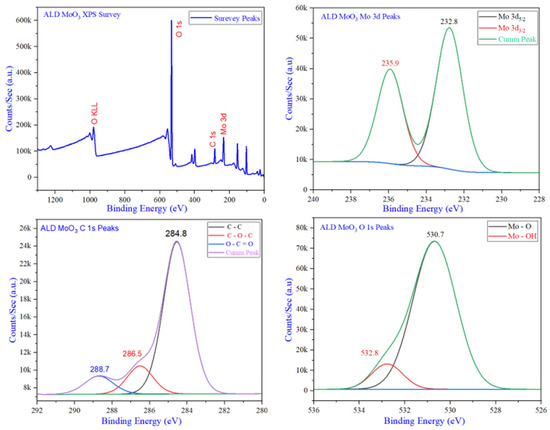 The high-intensity oxygen peak in the survey spectrum for MoO3 in Figure 10 and the intensity of Mo 3d peak confirm stoichiometric MoO3. The small C 1 s peak confirms the removal of the contaminated top layer due to ion etching. The O 1 s peak at 530.7 eV is also very close to the documented reference sample O 1 s peak at 531 eV in MoO3. Considering the issues related to carbon correction, the C 1 s adventitious carbon peak at 284.8 eV was used for peak referencing [61]. The carbon contamination is observed in the as-grown MoO3 ALD sample with the adventitious C-C charge reference at 284.8 eV with low-intensity peaks for C-O-C and O-C=O. The deconvoluted XPS binding energy peaks for MoO3 were resolved with a Shirley background to the characteristic Mo 3d5/2 and Mo3d3/2 doublet in Figure 10 at 232.8 eV and 235.9 eV. These Mo 3d peaks are fairly close to the standard spectrum ID 01285-04 of 232.2 and 235.4 eV, respectively [62].