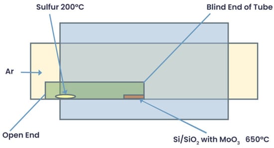 The ALD-grown MoO3 was sulfurized in a single quartz-tube CVD setup for MoS2. The functioning of CVD for the sulfurization of MoO3 powder to deposit MoS2 has been explained in detail in another dedicated article [63]. The sulfurization of the MoO3 deposited on the SiO2/Si substrate required modification in the traditional quartz-tube CVD, as shown in Figure 11.