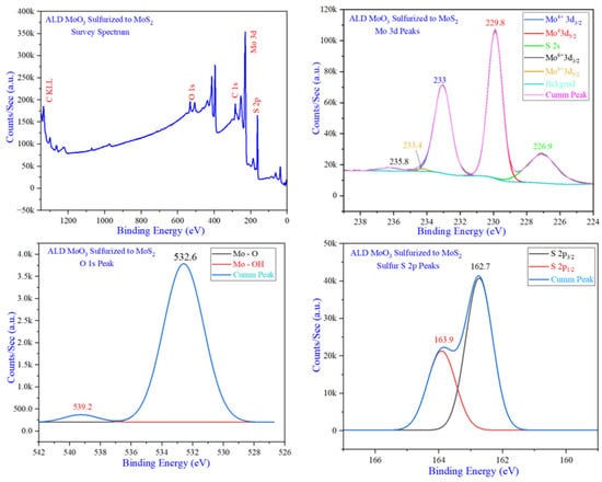The higher peak intensity of the S2p peak is also noticed in the XPS survey spectrum for the top MoS2 layers. There are two learning aspects from these deficient observations. First, using sulfur reactants like H2S, DMDS, etc., during ALD growth is a more effective method for stoichiometric ALD synthesis of MoS2 [66,67]. Second, a high thermal annealing procedure is required to ensure the diffusion of sulfur through the thickness of multilayer MoO3. The ALD recipe modification to achieve monolayer or bilayer MoO3 may also circumvent the sulfur diffusion problems. Here, it is to be noted that the NIST database lists several references that claim the stoichiometric MoS2 for the range of binding energy values for the peaks marked in Figure 12 [68].