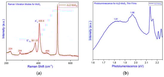 The difference greater than 19 cm−1 for the E12g and A1g peaks in Figure 14 signifies that the ALD MoS2 was multilayer. The reference study suggests that the separation of 24.35 cm−1 in the E12g and A1g peaks can be equivalent to the deposition of ten or more layers of ALD MoS2 [69]. A little consideration regarding the degrees of freedom for sulfur and Mo atoms, as represented in Figure 13a, lead to an understanding that the unconstrained state of sulfur causes an increase in the amplitude of the out-of-plane A1g mode of vibrations in monolayer MoS2. The increased A1g amplitude would result in a decreased E12g amplitude in monolayer MoS2. This change in amplitude causes a relative shift in Raman peaks for monolayer MoS2 is termed “Blue Shift,” resulting in a minimum distance between two peaks. With multilayer MoS2, sulfur atoms have reduced degrees of freedom with resistance from top and bottom layers, causing a decreased A1g and increased amplitude of vibration for E12g, which causes increased separation termed “Red Shift”. The photoluminescence characteristics evaluated in the past for monolayer MoS2 have one significant peak at 1.9 eV [70,71,72]. The multilayer ALD MoS2 evaluated here demonstrates the multiple peaks seen in Figure 14b caused by trion–exciton interactions due to multiple layers of MoS2. The Raman results of multilayer MoS2 are consistent with the thickness evaluation using AFM.