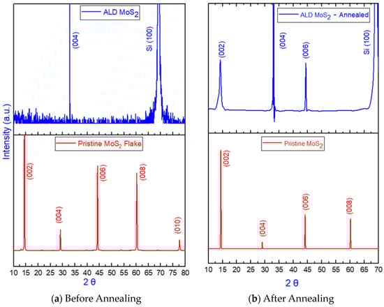 Figure 15a represents the MoS2 structure observed before annealing for ALD MoO3, ALD MoS2, and the pristine MoS2 flake. The XRD characteristic parameters for pristine MoS2 with precise harmonic peaks at (002), (004), (006), (008), and (010) confirm a crystalline 2H-molybdenite structure with the reference card 01-075-1539 and also validate the equipment settings and procedure adopted for XRD analysis [73,74]. However, the ALD MoS2 and ALD MoO3, which were not annealed, did not show a harmonic peak, which confirms that the structure is amorphous.
