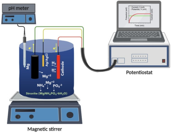 The experimental setup for the batch electrolysis experiments is shown in Figure 1. The working solution, prepared in a batch Pyrex ® reactor with a total volume of 200 mL, was either sodium chloride (NaCl) or ammonium hydrogen phosphate (NH4H2PO4) solution with NaCl. A cell consisting of a commercial grade Mg anode (total surface 4 cm2) and Pt cathode with a reference electrode (Ag/AgCl) was used. The anode was polished with 1000-grit sandpaper, rinsed with distilled water and dried with acetone prior to use. The constant current density was applied through a Potentiostat over the range of 10 to 100 A·m−2. Samples were withdrawn from the solution and magnesium and phosphorus concentrations were measured, after filtration through membrane filters (0.22 μm). The current applied across the electrodes and the potential developed between the electrodes were recorded from the potentiostat. The solution pH was monitored as well. The release of magnesium was accompanied by a voltage and pH increase. The main assumption was that the magnesium released from the anode may be used exclusively for struvite precipitation.