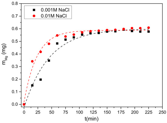 pH increase with time, was indicative of the metal dissolution process, as a result of which the electrolyte solutions in contact with the magnesium anode at OCP were enriched with respect to magnesium. The presence of increasingly higher magnesium concentrations with time was confirmed from the measurements of total magnesium concentration in the electrolyte solutions. The respective profiles are shown in Figure 3. Measurements showed that the (initial) dissolution rate in the 10 mM NaCl solution was R1 = 4.12 × 10−7 mol·min−1, and for 1 mM NaCl, it was R2 = 3.10 × 10−7 mol·min−1. Dissolution of magnesium reached a plateau corresponding to a quasi-equilibrium state.
