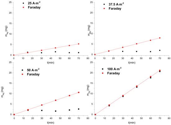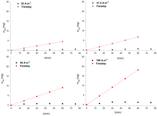 The dissolution of Mg anode applying different current densities was investigated in 1 mM and 10 mM NaCl electrolyte solutions and the results are shown in Figure 4 and Figure 5. The dissolved mass of magnesium was much lower than the theoretically calculated mass (Equation (6)), i.e., the deviation from the Faradaic behavior was high, ca 60% for the 1 mM NaCl solution and ca. 90% for the 10 mM NaCl solution. It was observed that as the current density applied increased, the deviation from the theoretically calculated value was smaller. Magnesium added in the solution by anodic dissolution was significantly higher only upon application of anodic current density equal or exceeding 100 A·m−2 for 1 mM NaCl concentration.