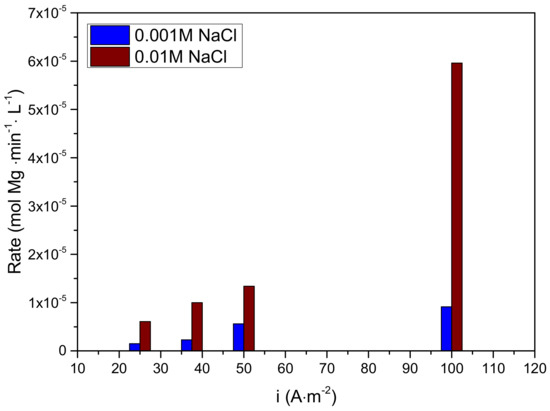 In 10 mM NaCl, the current efficiency was 100% only for current density 100 A·m−2. At lower current density (25.0, 37.5 and 50.0 A·m−2), the magnesium dissolved was more than twice the concentration in the solution present because of the metal dissolution at OCP. From the plots of magnesium released by anodic dissolution as a function of time, the initial rates of dissolution were computed for each current density for 1 and 10 mM NaCl electrolyte solutions. The results are shown in Figure 6.