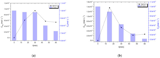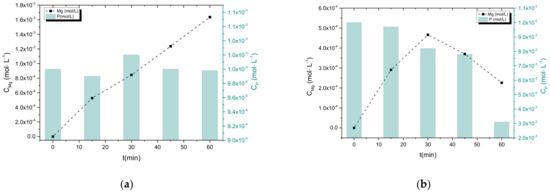 The first series of measurements of the kinetics of struvite precipitation refer to the precipitation of struvite from solutions with different NH4H2PO4 concentrations, which became supersaturated past magnesium anode electrodissolution. The measured concentration of magnesium and phosphate ions in the solution is presented in the graphs in Figure 7.