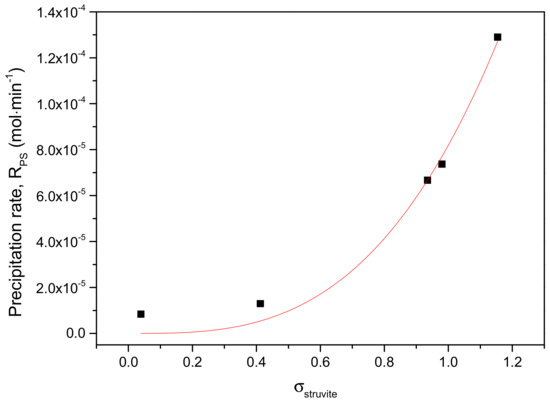 The dependence of the initial rates of struvite precipitation as a function of the relative supersaturation, σstruvite, for the first series of precipitation experiments is presented in the plot in Figure 8. The high order dependence of the rate on the relative supersaturation (n = 3 ± 0.4) suggested that the rate-determining step is surface diffusion of the struvite growth units on the crystallites formed. The apparent rate constant was calculated as ks = 8.19 × 10−5 mol min−1.