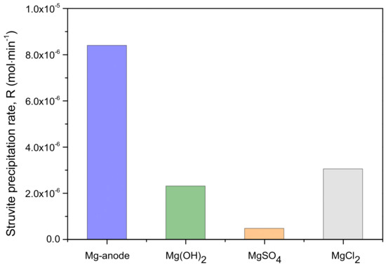 A comparison of struvite precipitation rate from supersaturated solutions with respect to struvite, using magnesium from the electrodissolution of the respective metal anode, brucite (from hydrothermal treatment of MgO) [27], magnesium chloride [28] and magnesium sulfate [29] as a source of magnesium in the respective solutions, is shown in Figure 9. As may be seen, magnesium originating from the Mg anode dissolution yielded the highest rates of struvite precipitation for the same relative supersaturation. This, in turn, suggested that at given conditions, making up the supersaturated solutions by electrochemically dissolved Mg, originating from the anode of the cell used, resulted in more efficient phosphorus recovery.