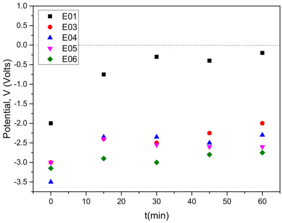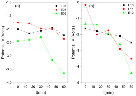 During the dissolution of magnesium and the subsequent struvite precipitation, the potential between the electrodes at the constant current applied was also measured (Figure 10). As shown, past 15 min or 30 min, for higher or lower initial phosphate concentrations in the working solution, respectively, the potential showed very little changes (almost constant). However, this does not indicate that electrodissolution stopped but that the precipitation process that begins seems to overcome the first process (also seen by the high rate). Furthermore, this small change in potential with time could also be attributed to the development of a solid film on the surface of the anode Mg electrode, which could inhibit further electrolysis of the magnesium anode, possibly because of passivation [30]. Further investigation of the parameters (current and potential) of the electrochemical process is needed for optimizing P recovery.
