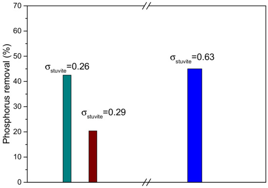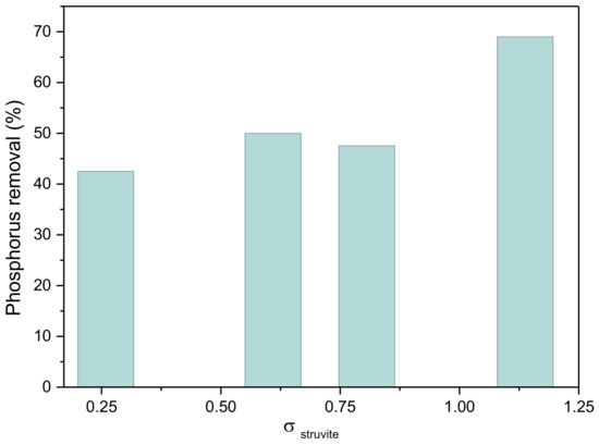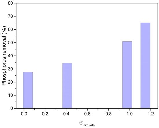 The phosphorus removal from the supersaturated solutions at different supersaturations with respect to struvite is presented in Figure 11. It is shown that the removal of phosphorus reached 65% corresponding to the solution with the highest initial relative supersaturation with respect to struvite (σstruvite = 1.15).