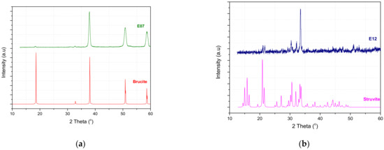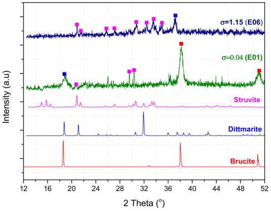 The solid precipitated from the supersaturated solutions used as a magnesium source. The magnesium derived from anode electrode electrodissolution consisted of hydrated phases of magnesium ammonium phosphate (NH4MgPO4·6H2O, struvite or NH4MgPO4·H2O, dittmarite) at higher relative supersaturation. However, for lower relative supersaturation, the formation of magnesium hydroxide was identified as well (Mg(OH)2, brucite). This was due to the higher rate of Mg2+ production from electrodissolution in comparison with the phosphate and ammonium consumption rate for struvite formation, resulting in the additional Mg(OH)2 precipitation. XRD patterns of the precipitates obtained (Expts. # E06 and E01) and of the standards are shown in Figure 12. The formation of MgO on the Mg electrode is also believed to take place because of the passivation of the electrode [30].