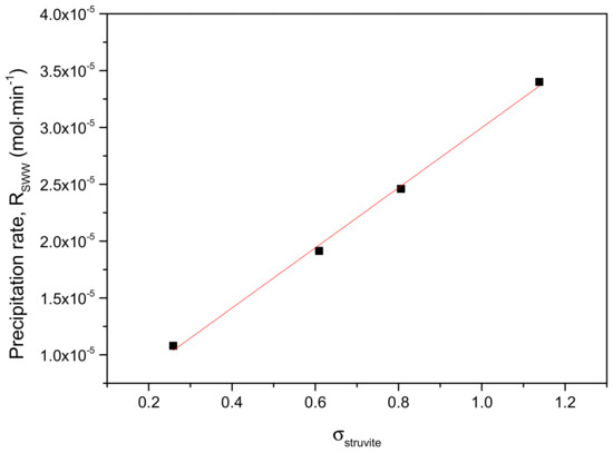 The plot of the measured rates of precipitation as a function of the relative supersaturation of SWW with respect to struvite is shown in Figure 16.
