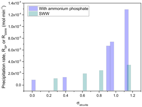 The rate of struvite precipitation was determined by the reduction in phosphate concentration in the solution and is presented in Table 4. The relative supersaturation concerning struvite was notably low compared to experiments that took place without simulating wastewater conditions due to the presence of other ions in the SWW, forming a number of complexes. All potential equilibria were considered in calculating the supersaturation.