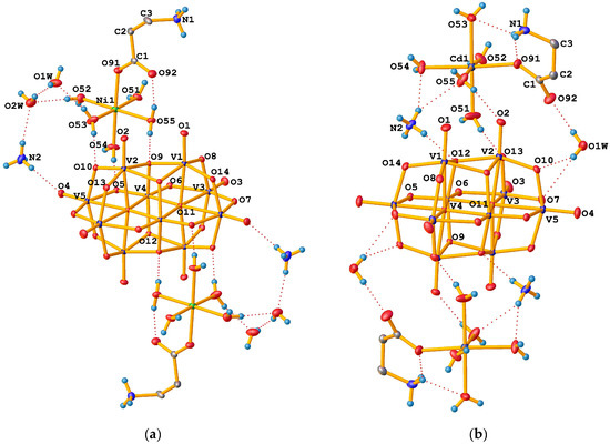 The asymmetric unit of tetrahydrates consists of one half of the [V10O28]6– anion with Ci symmetry lying on an inversion centre, one [M(H2O)5(β-HAla)]2+ cation, one NH4+ cation, and one water molecule in general positions (Figure 2b).