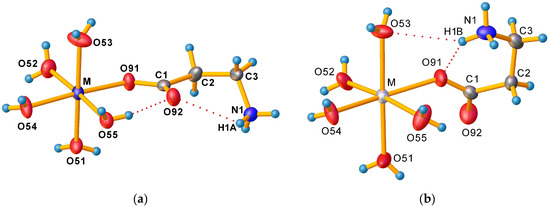 A detailed view of [M(H2O)5(β-HAla)]2+ geometry and intramolecular hydrogen bonds (a) in tetrahydrates and (b) in dihydrates. Displacement ellipsoids are drawn at 50% probability level.