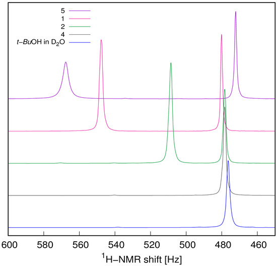To determine the spin state of paramagnetic central atoms in the [M(H2O)5(β-HAla)]2+ (M = CoII, NiII, MnII) complex cations, molar susceptibilities of the complex cations in the solutions of 1, 2, and 5 were determined based on the paramagnetic shift of the 1H-NMR signal of the t-Bu group in the paramagnetic solution against the diamagnetic reference (3% v/v t-BuOH solution in D2O). For the assessment of diamagnetic contribution, the 1H-NMR chemical shifts of the signal belonging to the t-Bu group in the solution of 4 and in a blank sample containing t-BuOH in D2O were also recorded (Figure 4).