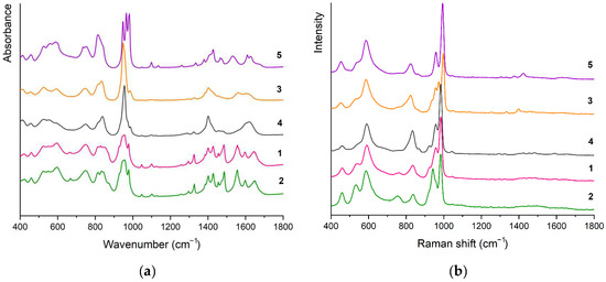 The FT-IR (Figure 5a) and FT-Raman (Figure 5b) spectra of crystalline 1–5 are quite similar because of the same chemical components present. The FT-IR and FT-Raman spectra of the individual compounds are mutually compared on Figure S1a–e. The assignments of the bands are summarised in Table S4 [7,21,53].