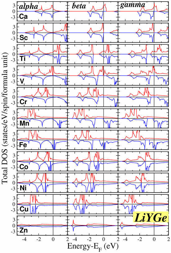- Damewood, L.; Busemeyer, B.; Shaughnessy, M.; Fong, C.Y.; Yang, L.H.; Felser, C. Stabilizing and increasing the magnetic moment of half-metals: The role of Li in half-Heusler LiMnZ (Z=N,P,Si). Phys. Rev. B 2015, 91, 064409. [Google Scholar] [CrossRef]
