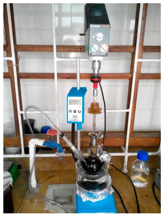 Magnetite powder was obtained in the laboratory through the coprecipitation method. The coprecipitation process involved preparing magnetite powders by a wet method and then adding a basic solution to a solution containing iron (II) and (III) ions, in stoichiometric proportions, until a certain pH value was reached. Coprecipitation offers a series of advantages that are essential for obtaining magnetite powders with properties suitable for special applications; such powders cannot be obtained by conventional ceramic processes. Coprecipitation offers simple and fast preparation of the compounds, reproducibility of the chemical composition, and good control over the particle size distribution through coprecipitation process parameters [39]. It should be noted that the temperature is an important factor in the coprecipitation process, determining the primary size of the crystallites, the specific surface, and even the phases that are formed. The experimental setup used for magnetite synthesis is shown in Figure 1, and the chemical substances were purchased from Sigma-Aldrich (St. Louis, MO, USA). To obtain pre-defined magnetite nanopowder, precisely determined amounts of 0.04 mol of FeCl3·6H2O and 0.02 mol of FeCl2·4H2O were dissolved in 200 mL of distilled water that had been previously degassed under nitrogen flow (to prevent oxidation of the Fe2+ ions). The solution thus obtained was transferred to a 3-neck flask located on a water bath pre-heated to 75 °C. Later, 25 mL of a 25% NH4OH basic solution was added to the solution of iron cations as a coprecipitating agent. In a very short time, the appearance of a black precipitate characteristic of magnetite formation was observed (as shown in Figure 1). The mixture was kept under stirring for 30 min. It should be mentioned that the whole process was carried out in a controlled atmosphere by introducing a constant flow of 50 mL/min. of N2 into the system. The solid product (magnetite) was separated by magnetic decantation, washed with distilled water to remove excess basic solution, and dried in an oven at 50 °C for 12 h.