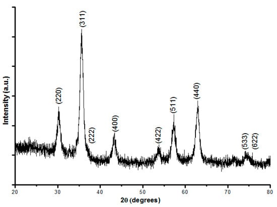 The obtained magnetite was characterized by X-ray diffraction (XRD) to verify the success of the synthesis process. X-ray diffraction is very useful for determining the qualitative phases of studied samples because all crystalline materials possess a characteristic “fingerprint”, determined by the size of the elementary cell and the numbers and positions of cations in the crystal lattice. The unequivocal identification of the crystalline phases present in the diffractograms was carried out according to the powder diffraction data collected in a database known as JCPDS (Joint Committee on Powder Diffraction Standards) [40]. The diffractogram recorded for the synthesized material is shown in Figure 2.