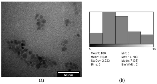 (a) TEM micrograph of magnetite functionalized with carboxymethylcellulose; (b) size distribution of magnetite particles functionalized with carboxymethylcellulose.