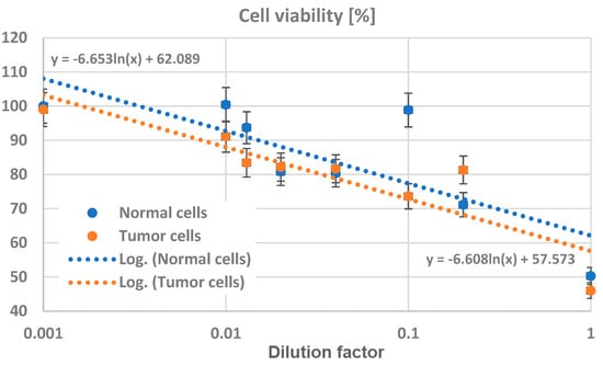 The cell viability was assessed by the MTT (3-(4,5-dimethylthiazol-2-yl)-2,5-diphenyltetrazolium) assay. After the treatment time expired, the medium was discarded, and the cells were washed with PBS and overlaid with 100 µL of fresh complete medium. Then, 10 µL of MTT (5 mg/mL) was added to the medium, and the cells were incubated for 3 h. DMSO (dimethyl sulfoxide) was used to dissolve the formazan formed as a result of the metabolism of living cells, and their absorbance was recorded at 570 nm using a plate-reading spectrophotometer. The cell viability (%) was calculated using the following formula: % cell viability = sample [absorbance]/control [absorbance] × 100. The results are summarized in Figure 7. The experiments were performed in triplicate with similar results.
