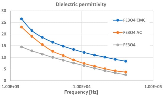 The dielectric properties of the concentrated solutions of nanoparticles are presented in Figure 8 and Figure 9, to 1 MHz, which is the most relevant frequency for defining the polarization features. Regarding the relative dielectric permittivity, the high values can be seen in Figure 8, especially at lower frequencies, where interfacial polarization plays a relevant role for the activated magnetite samples. When the frequency increased, a normal decrease in the permittivity values was observed. The effect of additional dipolar polarization explains the higher permittivity of the magnetite functionalized with carboxymethylcellulose in all frequency domains.