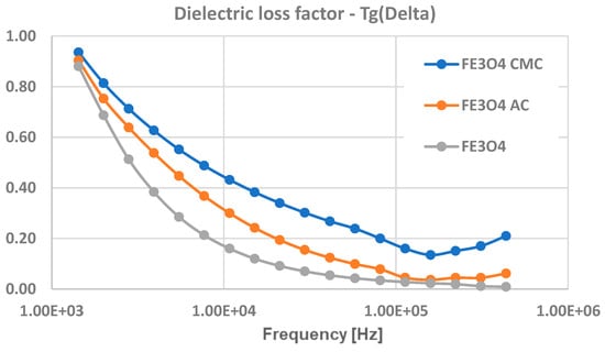 The dielectric loss factor observations (Figure 9) agree with the dielectric permittivity results. Here, the interfacial polarization effect was obvious until 10 kHz, and after 100 kHz, the effect of dipolar polarization explains the higher values for magnetite functionalized with carboxymethylcellulose and the slight increase in dielectric loss at higher frequencies (over 100 kHz). In summary, the dielectric loss factor values were remarkably high, which is in fact a strong argument for the relevant activity of such assemblies in the electromagnetic field and a prerequisite for their potential use as contrast agents.