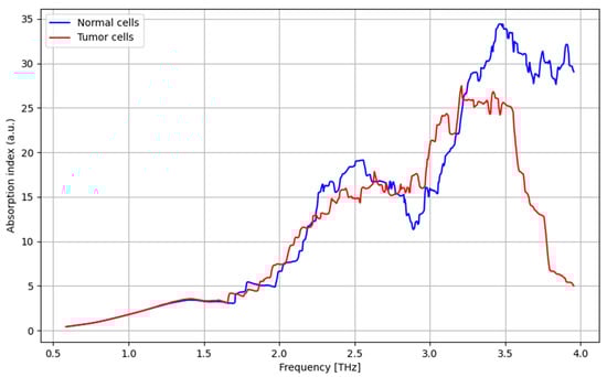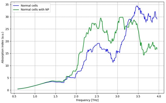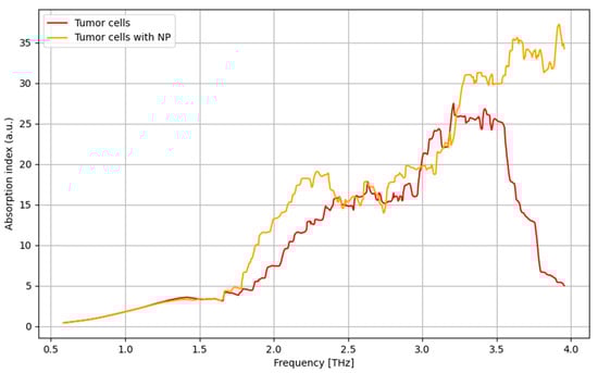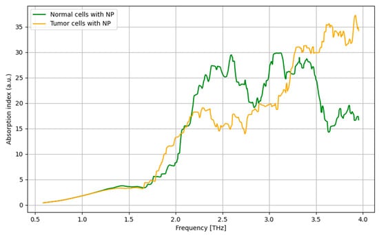 To verify the technique and/or the applicability of using the nanoparticles, it was first anticipated that the THz signal coming from cancer cells treated with contrast chemicals would be at least three times higher than that of normal cells treated with nanoparticles. Accordingly, comparing the signals in Figure 15 and Figure 16, we can see that the addition of magnetite functionalized with carboxymethylcellulose increases the signal by at least five times, making it possible to distinguish tumor cells from normal cells with more precision. However, the inclusion of nanoparticles changes the frequency range in which this kind of distinction is feasible (in our example, from 3 THz to 3.5 THz).