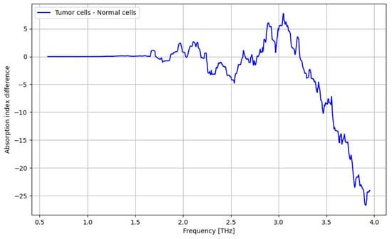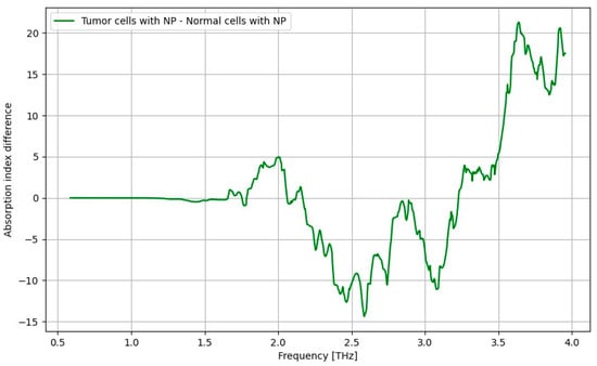Figure 15 and Figure 16 present the results of the analysis using the THz spectroscopy method with and without nanoparticle assistance. The analysis evaluated the signal difference, with the positive values being relevant. As can be observed in Figure 15, the signal difference was small and primarily occurred in the 2.8–3.2 THz domain, making it difficult to carry out a direct comparative examination of the tumor cells and normal cells. However, as Figure 16 shows, using nanoparticles can improve the direct comparison analysis between tumor and normal cells. The signal was amplified in the 3.2–4 THz range in this instance.
