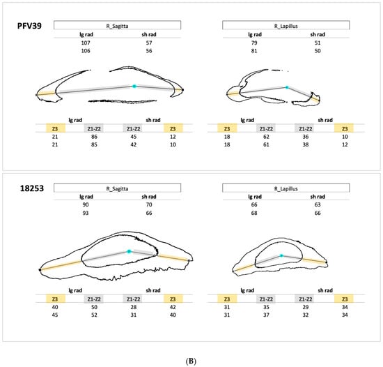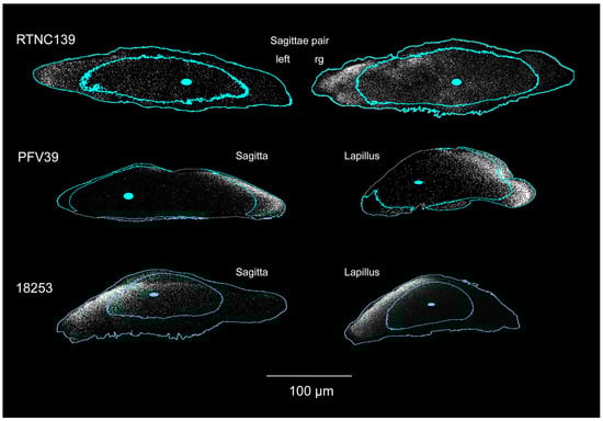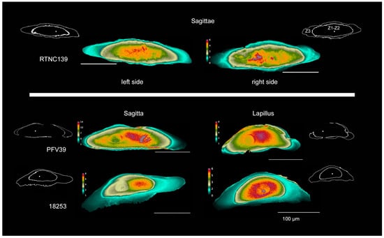 - Lychakov, D.V.; Rebane, Y.T.; Lombarte, A.; Fuiman, L.A.; Takabayashi, A. Fish otolith asymmetry: Morphometry and modeling. Hear. Res. 2006, 219, 1–11. [Google Scholar] [CrossRef] [PubMed]