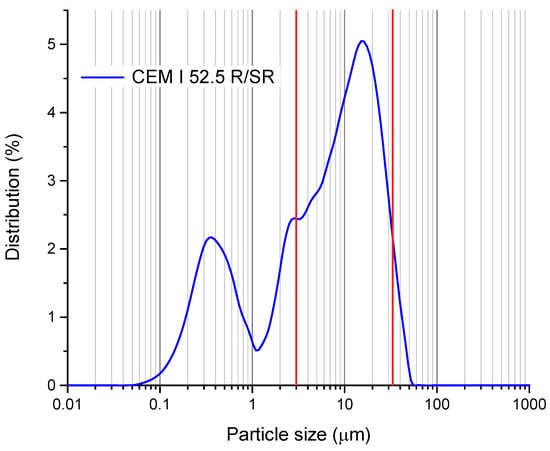 Ordinary Portland cement, CEM I 52.5 R/SR, was used in this study. The particle size distribution of cement measured by laser diffraction is shown in Figure 1. As observed, the cement has a particle size distribution between 0.04 and 60 μm []. The mean and median particle sizes are 8.09 μm and 5.1 μm, respectively. The range of suitable particle sizes for the hydration process of cement is between 3 and 32 μm (red lines in Figure 1) [,]. This cement presents a percentage of 90.61% of particle sizes in the suitable range. Thus, the particle size is significantly suitable to achieve very efficient hydration reactions.